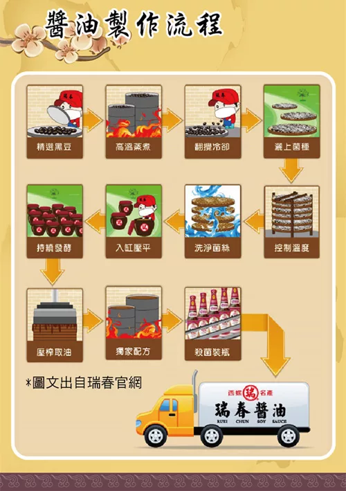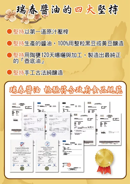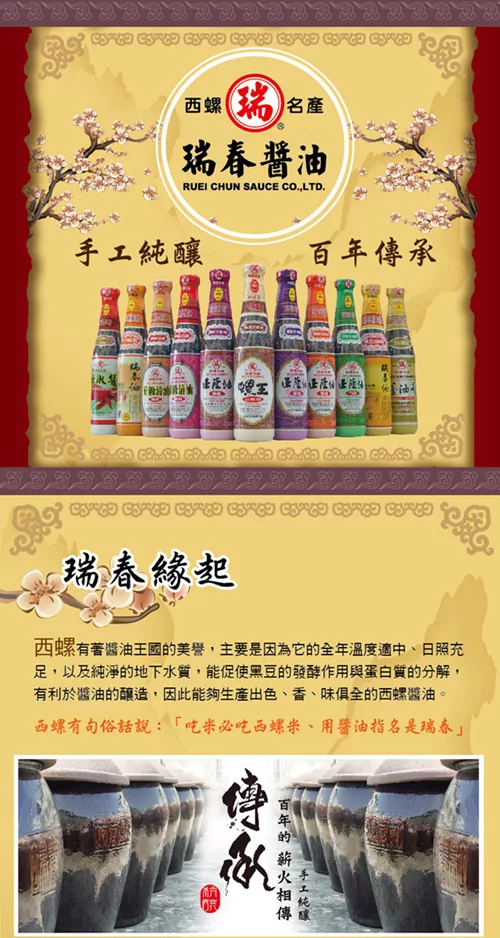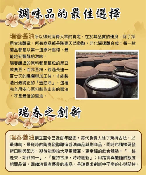 《瑞春醬油》傳承了『瑞春伯』純黑豆古法甕釀的技術,九十餘年一路走來始終如一,奠定了『醬油』的獨特風味與品質的保證。